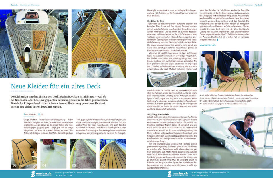 Mit grosser Freude präsentieren wir unser aktuelles Flexiteek-Projekt, das in Zusammenarbeit mit unserem geschätzten Kunden Pro Nautik in Romanshorn umgesetzt wurde. Die kürzlich in der renommierten Fachzeitschrift marina.chveröffentlichte Reportage zeigt eindrucksvoll, wie hochwertige Materialien, präzises Handwerk und gelebte Partnerschaften zusammenwirken. Wir sind stolz darauf, mit unseren Partnerwerften und Installateuren ein starkes Netzwerk aufgebaut zu haben, das auf Vertrauen, Engagement und fachlicher Exzellenz basiert. Diese Zusammenarbeit ist für uns von unschätzbarem Wert und bildet das Fundament für die erfolgreiche Realisierung anspruchsvoller Projekte. Gemeinsam setzen wir neue Massstäbe im Flexiteek-Bereich und zeigen, was echte Partnerschaft in der nautischen Branche bewirken kann.